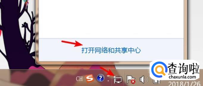 点击右下角的网络图标,打开后点击‘打开网络和共享中心’