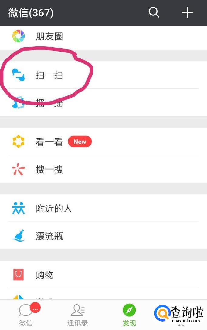 点击进入“发现”,找到“扫一扫小程序”。或者直接点击右上角“+”号,进入扫一扫。
