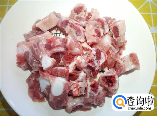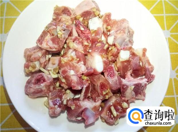 把剁碎的姜蒜加入排骨中,再加入适量的花生油、酱油、蚝油、盐,搅拌均匀,腌制半小时。