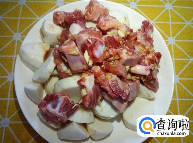 然后再把腌制好的排骨和芋头一起搅拌均匀,放一个大碟子中。