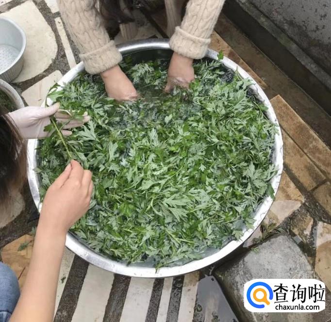 将采摘好的新鲜艾草先倒在地上将里面不小心掺杂的杂草挑出来,然后用清水清洗几遍直至里面的泥沙洗净,水不在变浑浊为止。在锅里装约一半的水,煮沸后,将清洗好的艾草放进锅中,加少量碱,为防止艾草变黄,煮的时候不要盖上锅盖。