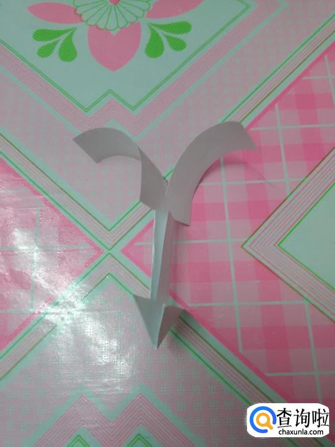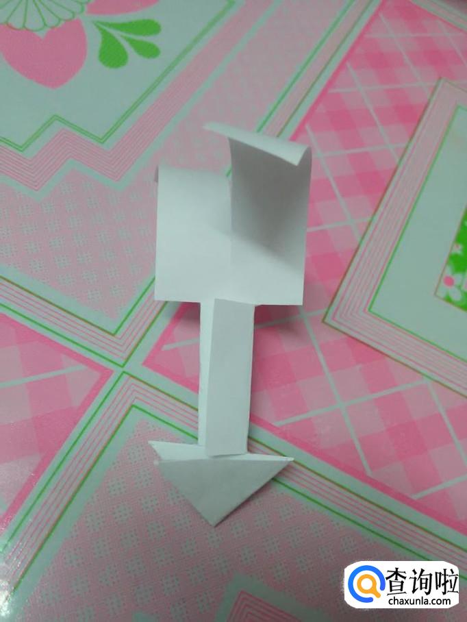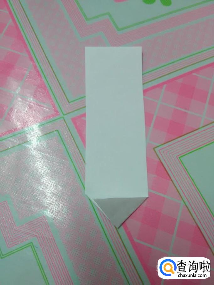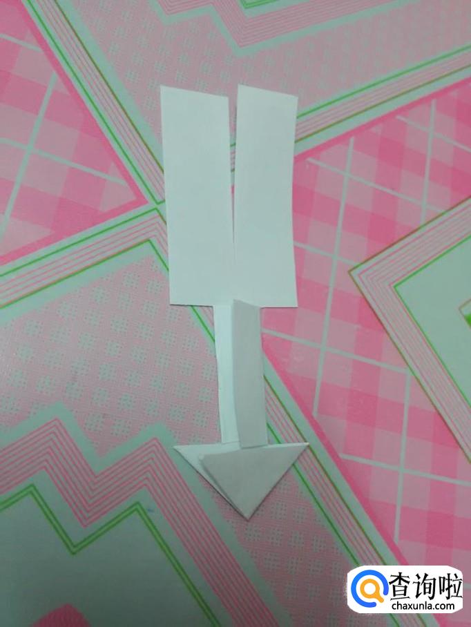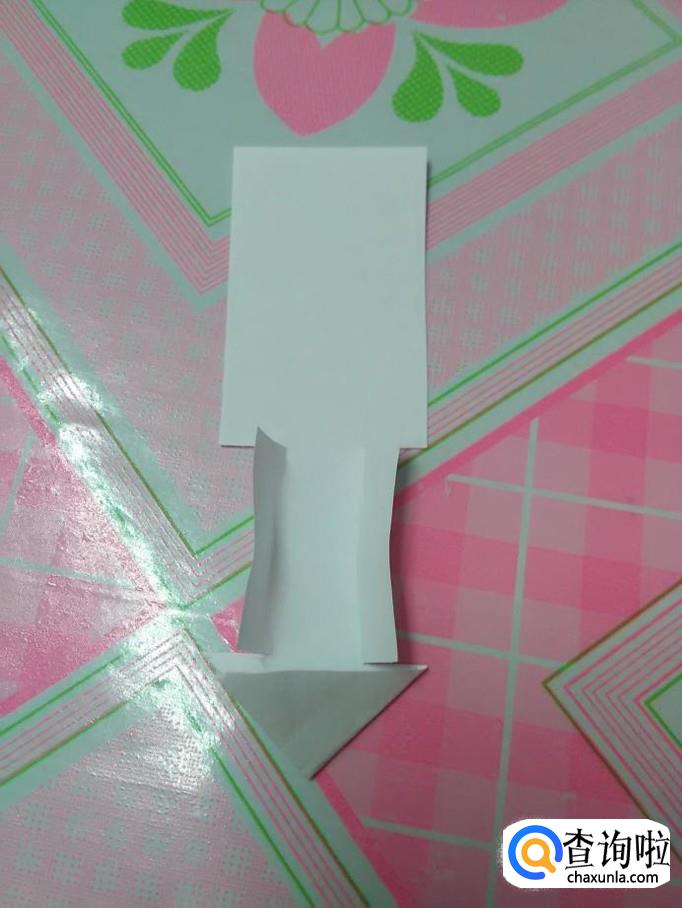 用剪刀把三角形上方左右两边各剪开三分之一的宽度,然后把两边往中间折,折成一个细细的脖子状。