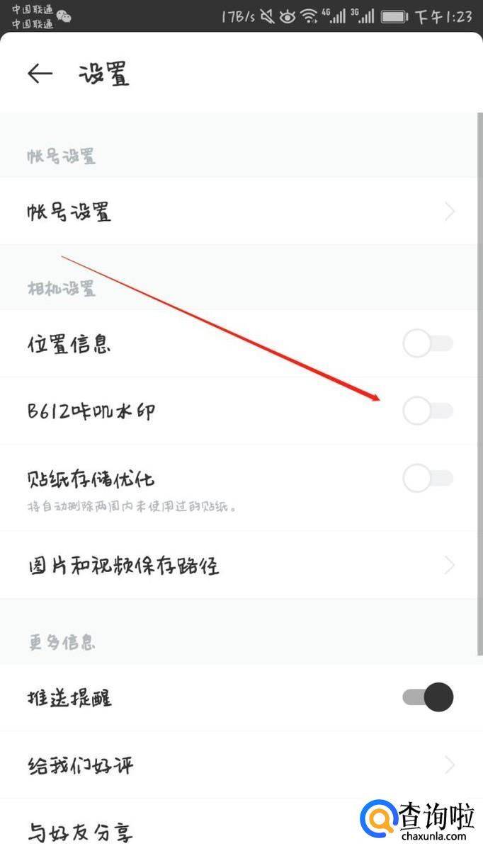 打开设置,页面如下。在水印处关掉即可去掉B612相机水印。