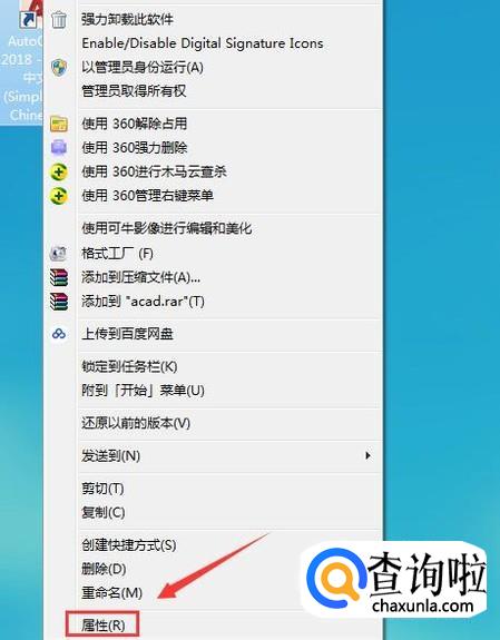 在桌面上找到CAD的快捷图标,单击鼠标右键,在右键菜单哪里找到属性选项,如图所示:
