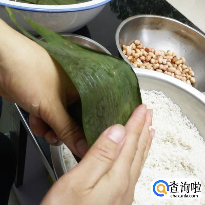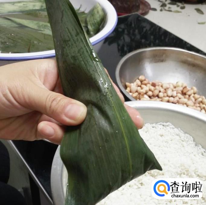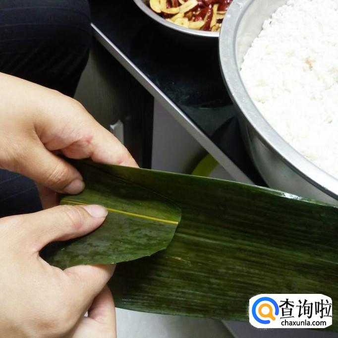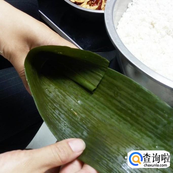 拿一个粽叶,根据粽叶大小,用光滑的一面,从底部往上面折,再往里折,形成漏斗形状。