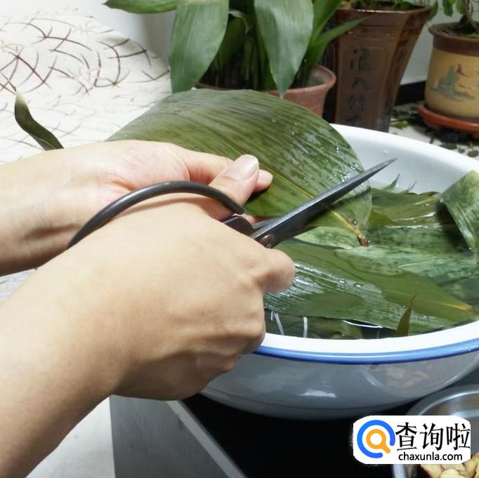 粽叶泡在水中,把头部减掉两厘米,变得平整一些。