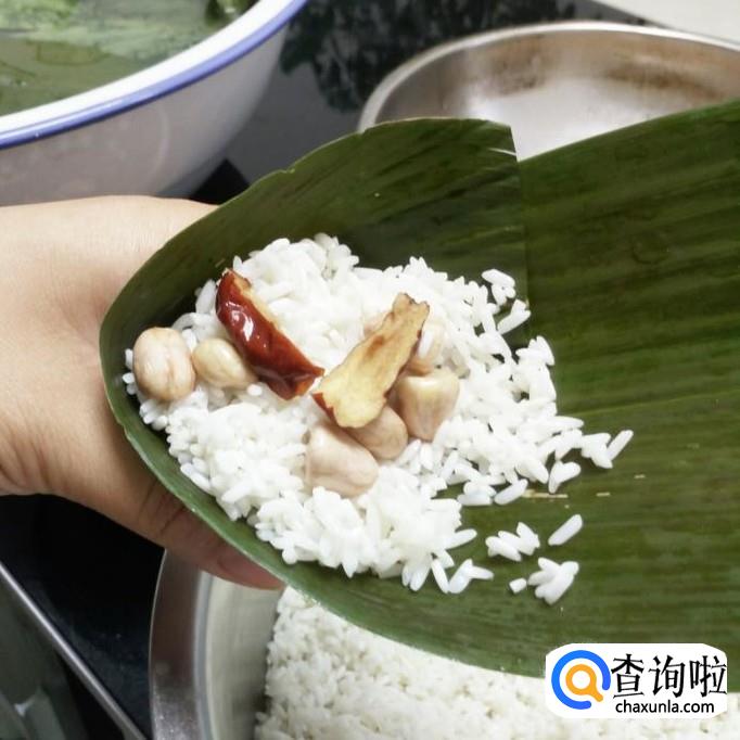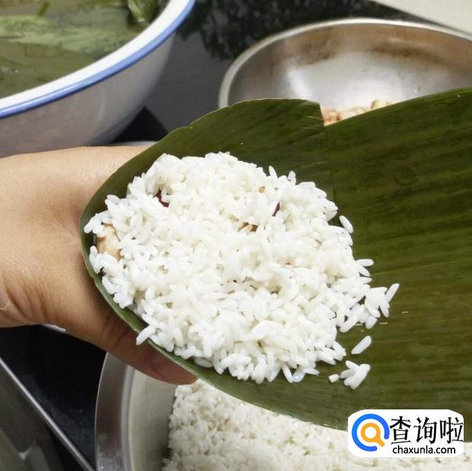 糯米铺平整,把余下的粽叶盖在上面,多余的叶子这在一边。
