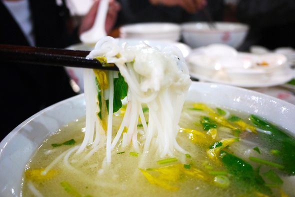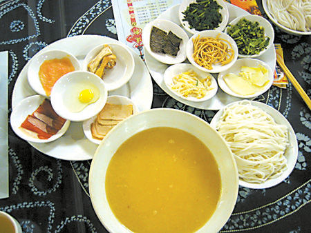 辅料有来过的豌豆尖、韭菜,以及芫荽、葱丝、草芽丝、姜丝、玉兰片、氽过的豆腐皮;四是主食,即用水略烫过的米线。鹅油封面,汤汁滚烫,但不冒热气。