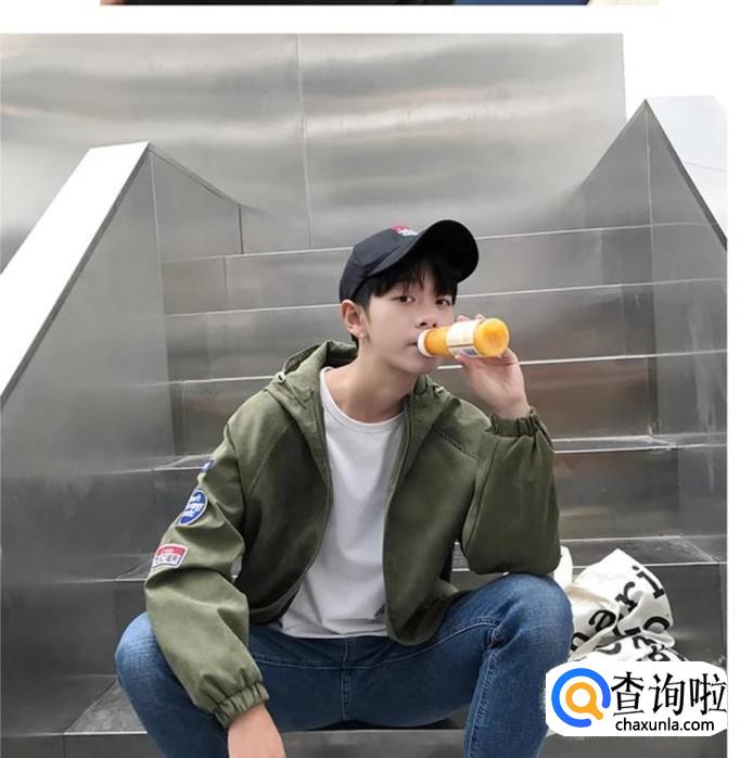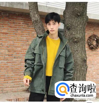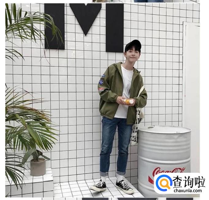 军绿色外套搭配纯白色衬衫,蓝色牛仔裤及黑色帆布鞋,显得帅气又阳光。