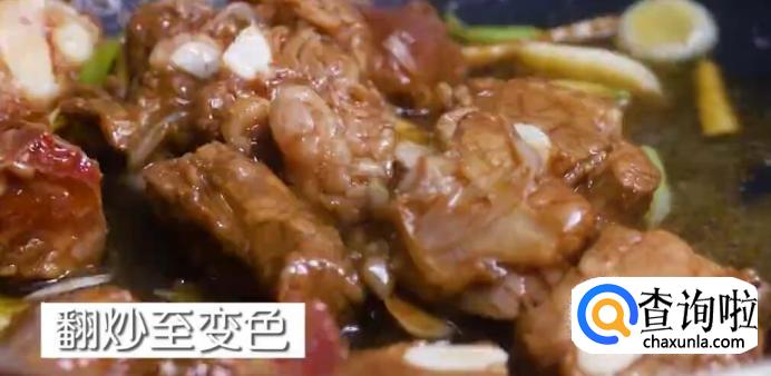 将排骨翻炒至变色。