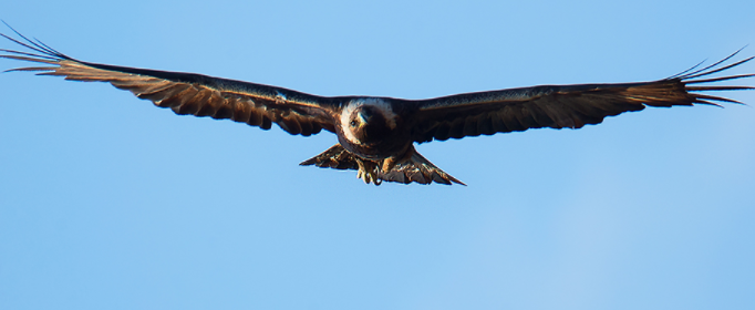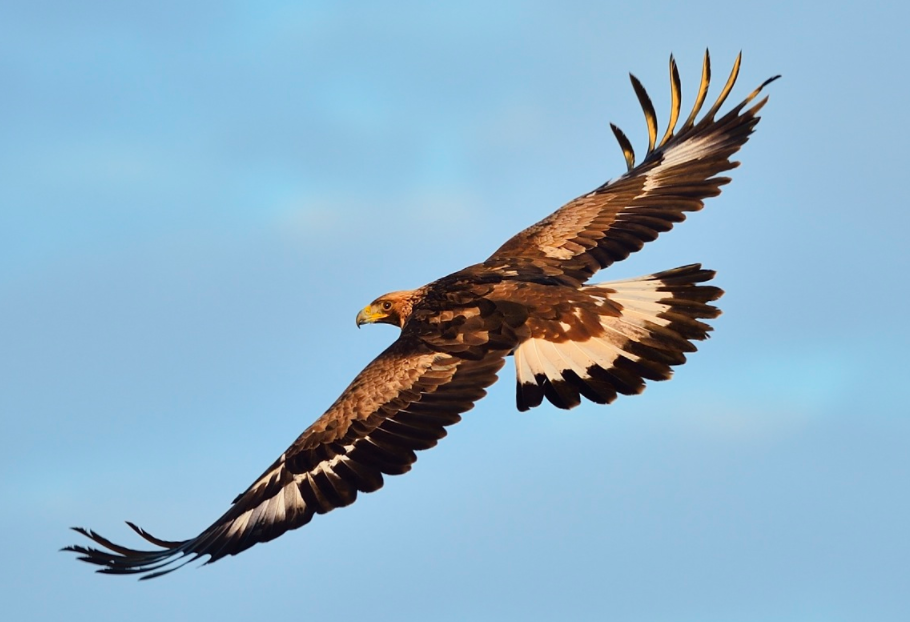 金雕是大型猛禽的代表种类,性情凶猛。嘴部的最前端有一个尖锐的弯钩,主要用于撕裂猎物,内趾和后趾上的爪更为锐利。捕食时常以每小时300千米的速度从天而降,它捕食的猎物有数十种之多,甚至可以在草原上长距离地追逐狼,所以金雕被称为猛禽之王。