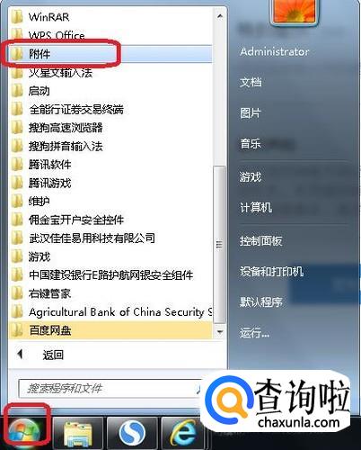 另外,我们点击开始菜单,点击“所有程序”,找到“附件”。