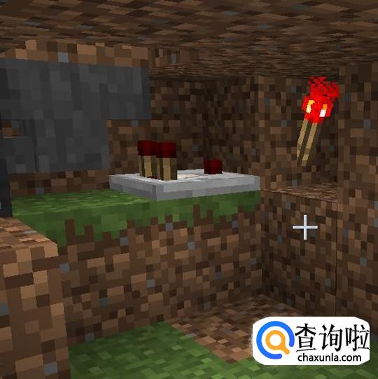 红石比较器的一侧的泥土的拐角挖掉,插上一个红石火把。