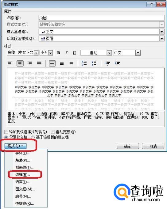 出现“修改样式”选项框,我们点击左下角“格式”,下拉菜单中选择“边框”。