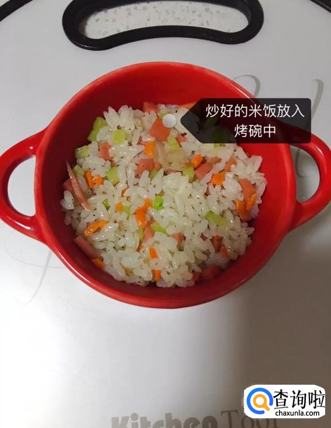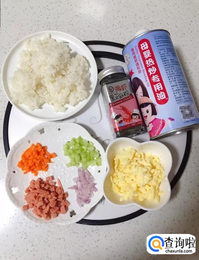 首先准备好所有要用到的食材,如下图所示。小贴士:米饭一碗,我们喜欢吃的蔬菜丁适量,芝士适量。