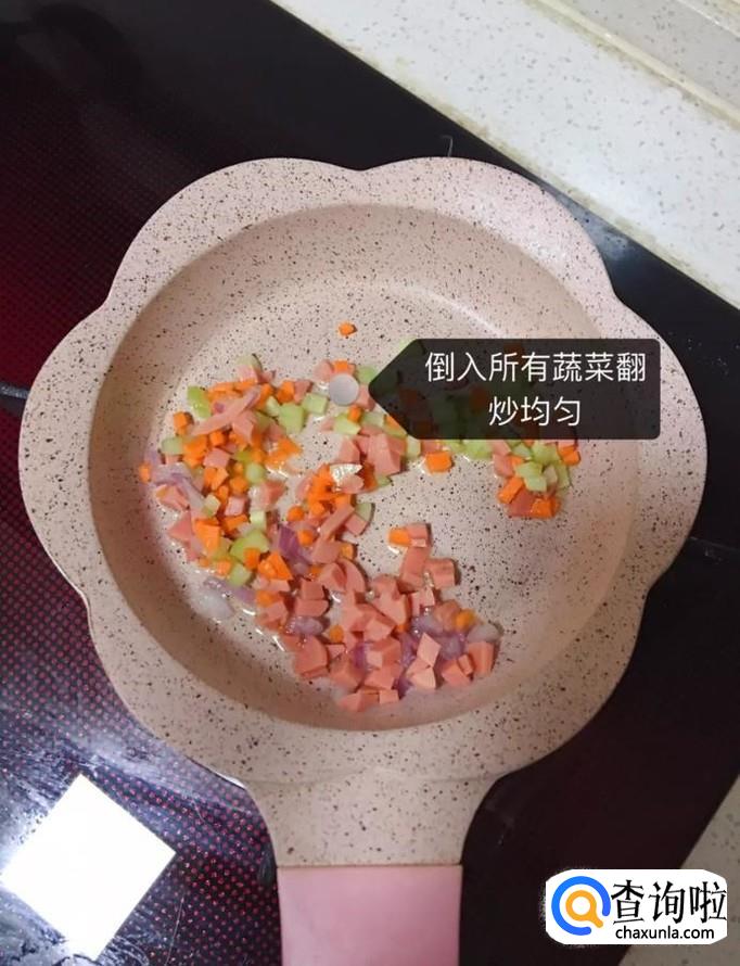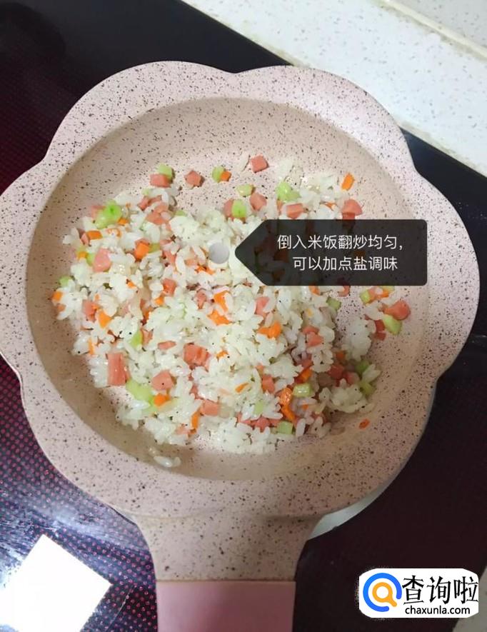 然后倒入适量的米饭,翻炒四分钟,如下图所示。小贴士:大家可以在这一步的时候,适量的加入一些我们自己喜欢吃的调料。