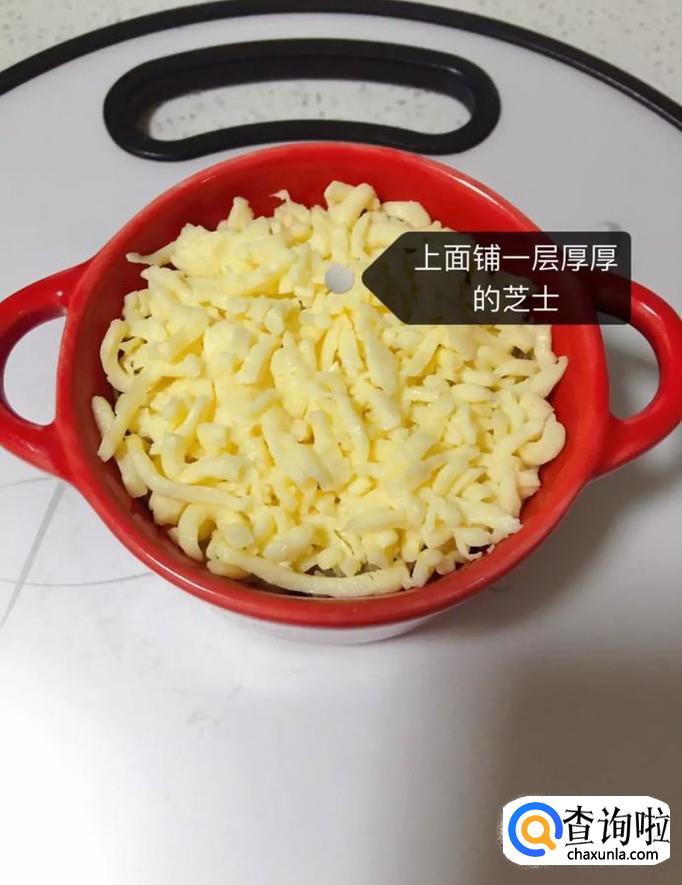然后表面上铺上一层厚厚的芝士,如下图所示。