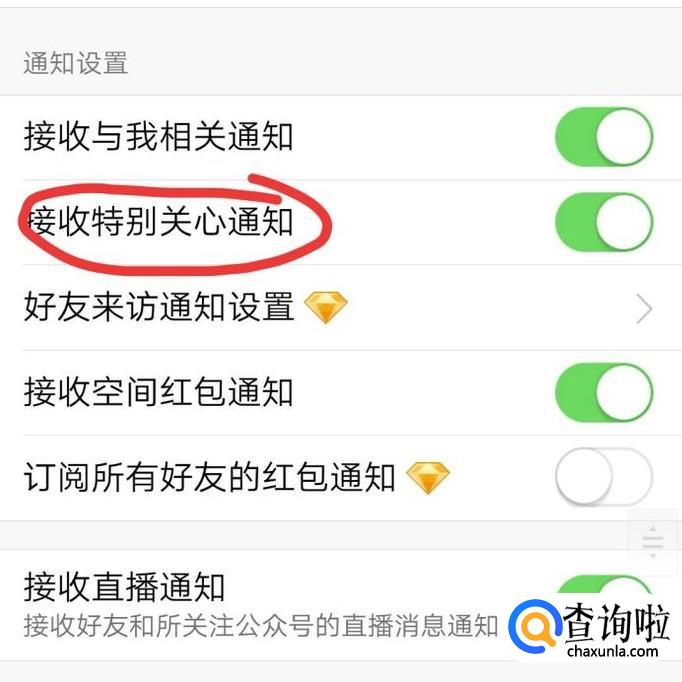 点击之后,我们可以看到下图一所示的界面,点击小编圈起选项,然后将“接受特别关心通知”开启,就OK啦!