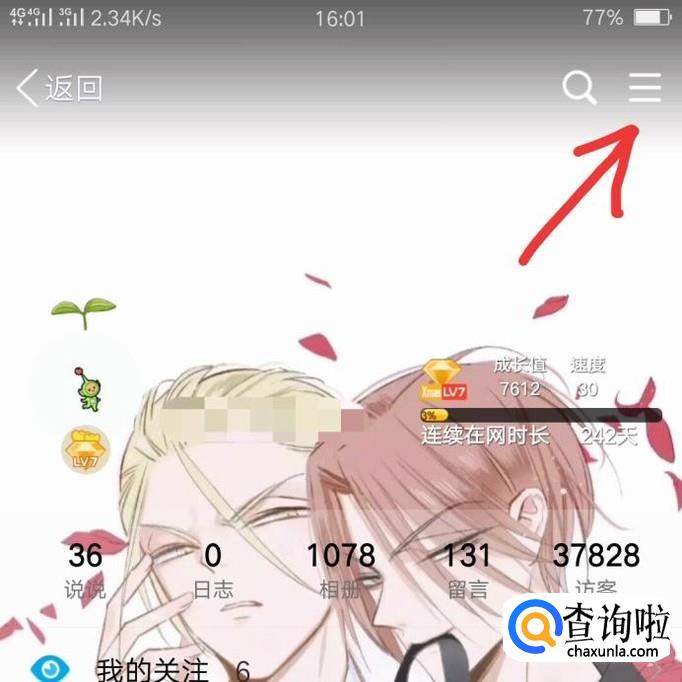 因为是与QQ空间特别关心有关,所以我们需要进入空间进行设置一下,进入自己的QQ空间,然后点击右上角的符号,也就是小编箭头所指的地方。