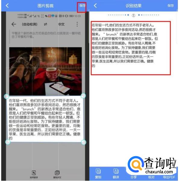 在图库选中需要识别的纸质文件图片,然后点击右上角的【保存】,图片中的文字就会提取出来,然后就可以复制粘贴到word中保存为电子档了。