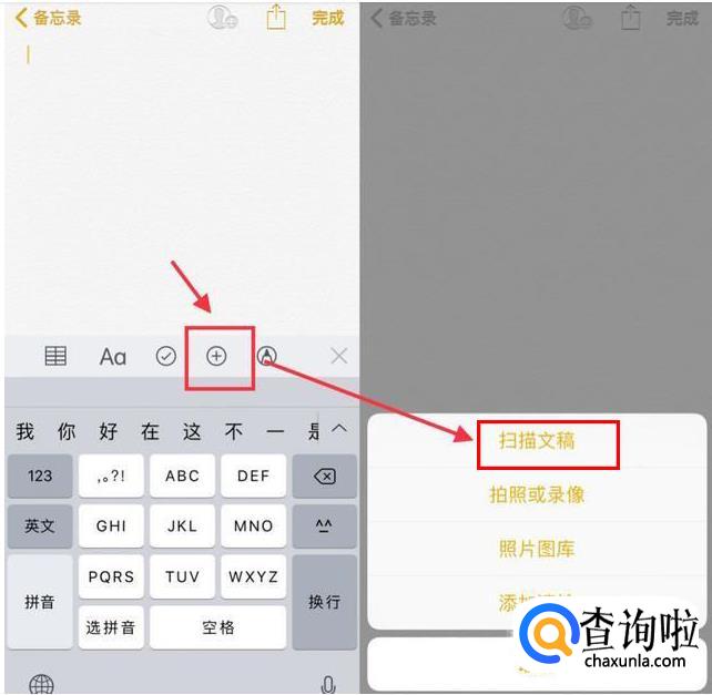 首先打开iPhone备忘录功能,进入后就新建一页记事本,建好后点击“+”号按钮,这时就会出现【扫描文档】选项。