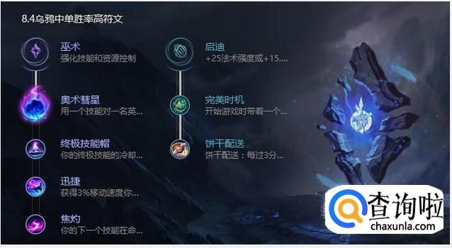 符文是一把游戏的关键,配置好的符文可以让你领先于起跑线上面,那么,新的乌鸦的符文是什么样子的呢?小编在这里推荐带巫术系符文奥术彗星,彗星可以极大的增强乌鸦前期在线上的压制力