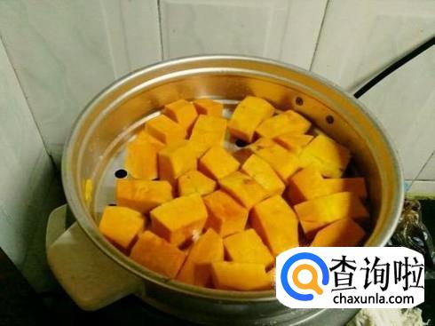 取一蒸锅,把南瓜块放入笼屉里,隔水蒸熟。