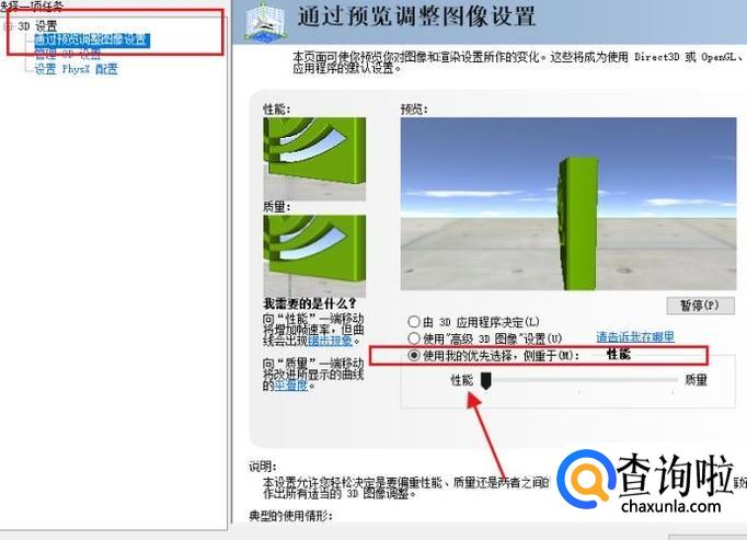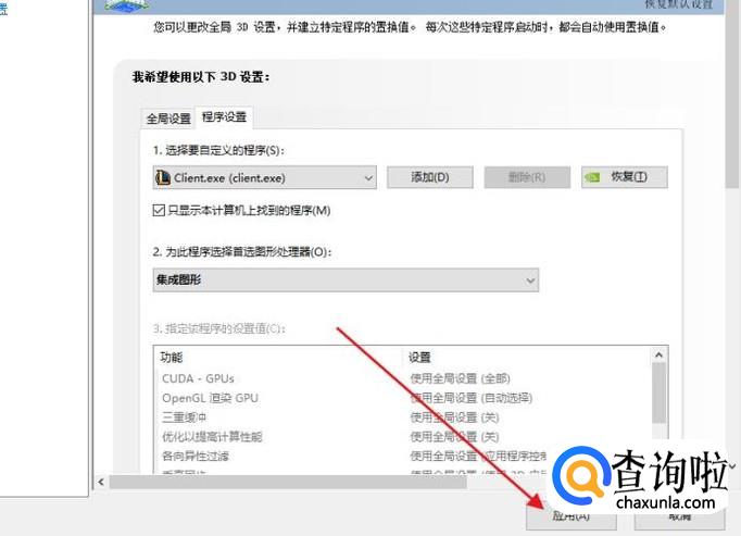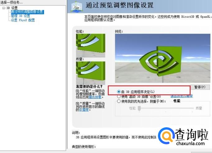 如果不想让独立显卡一直工作,只有在运行大型程序的时候工作,那么点击“由3D应用程序决定”的按钮。