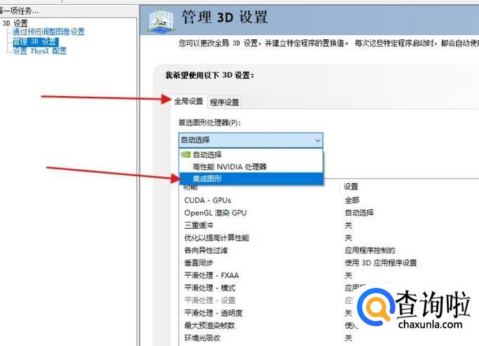 接着单击“全局设置”,将首选显卡设置成集成显卡,这样计算机两个显卡就能交替使用了。