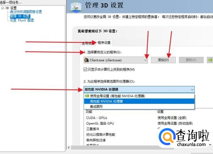 然后在窗口的左上角选择“管理3D配置”,找到“程序设置”,下边一行可以添加使用独立显卡工作的程序(设置为首选独立显卡)。