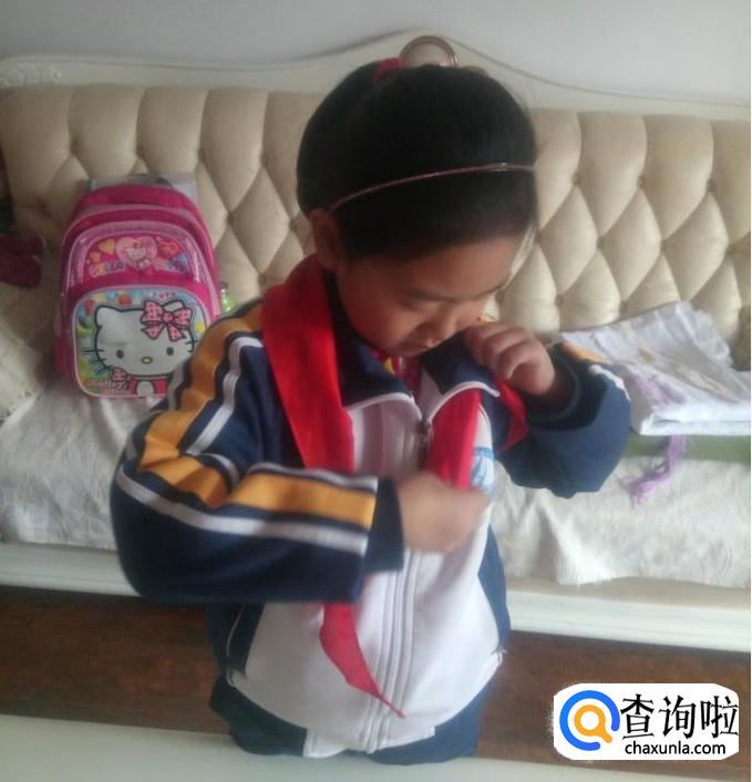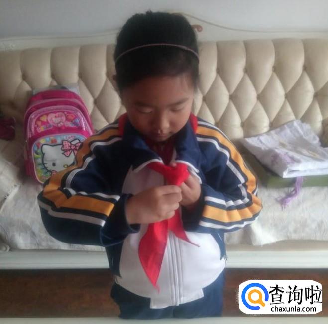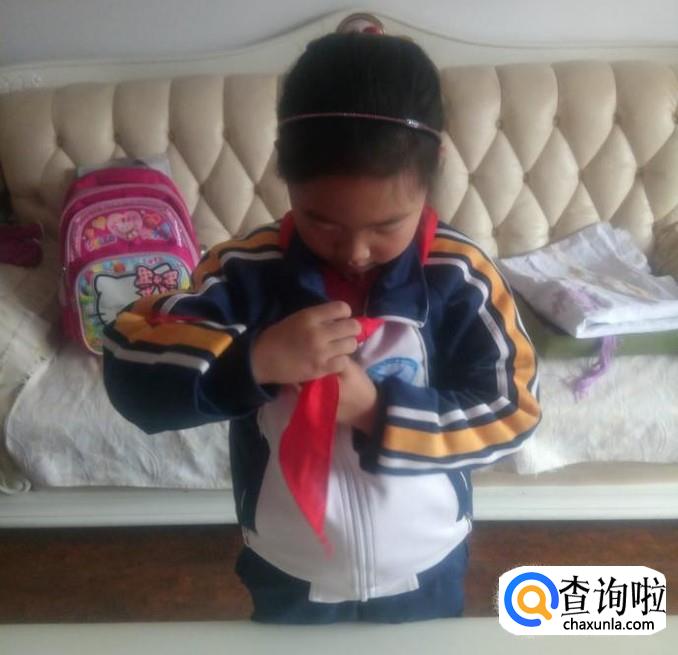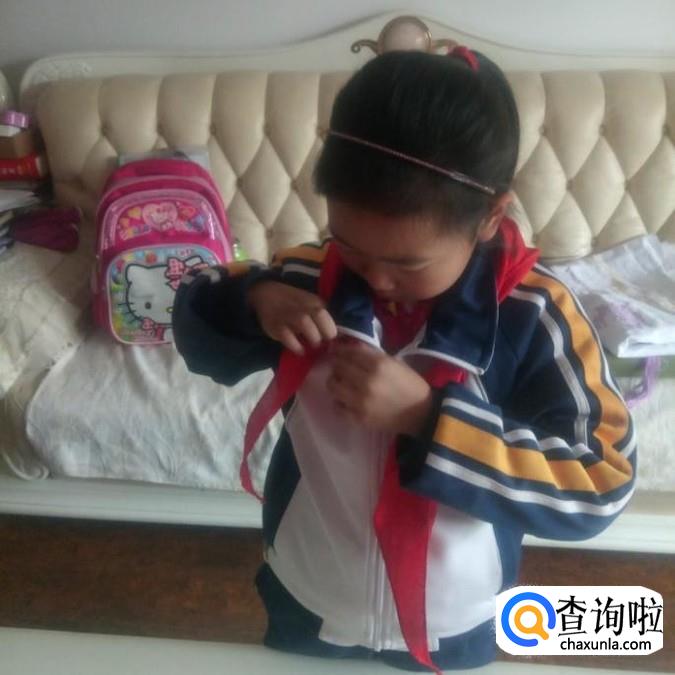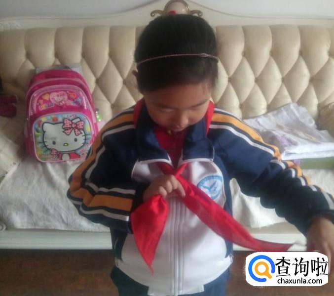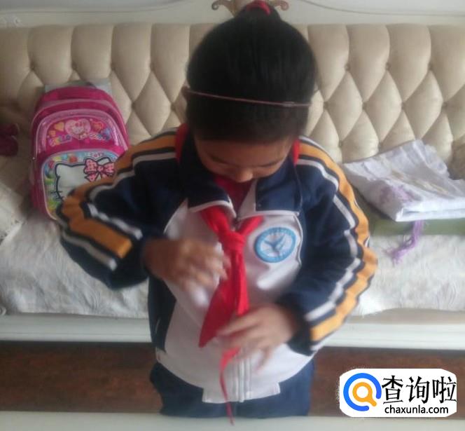 把红领巾的右角穿进校服领子里去,注(这是老师让妈妈把领子缝起来的,因为领子的角总是翘起来,所以老师给我们想起了这个办法,缝起来后领子的角就不翘翘了,这样很美观。)
