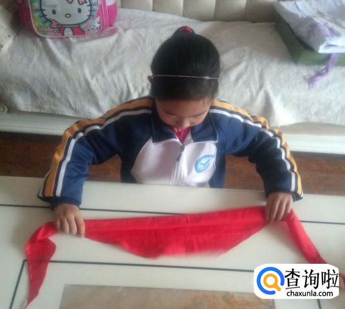 先把红领巾放在桌子上里平,对折三次,往有角的那边对折成三角形△