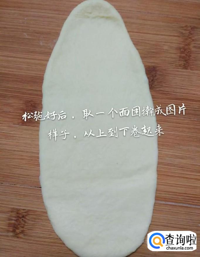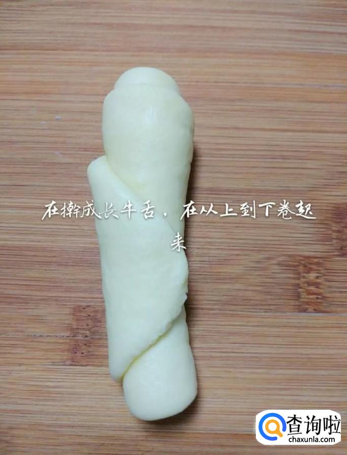 然后发面团擀成牛舌状,如下图所示。
