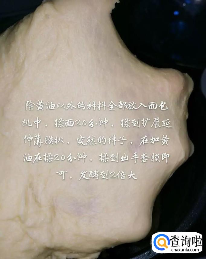 然后将除黄油以外的所有材料倒入面包桶,揉面20分钟,之后加入黄油继续揉面20分钟,揉到出手套膜的形态就可以了。