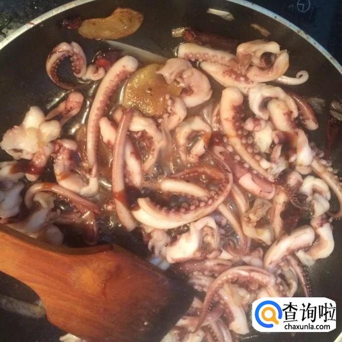 锅中加入适量植物油,油热后放入姜片,倒入焯过水的鱿鱼,加入少量蚝油提现,再放少量食用盐和鸡粉,翻炒两份中就可以出锅了。