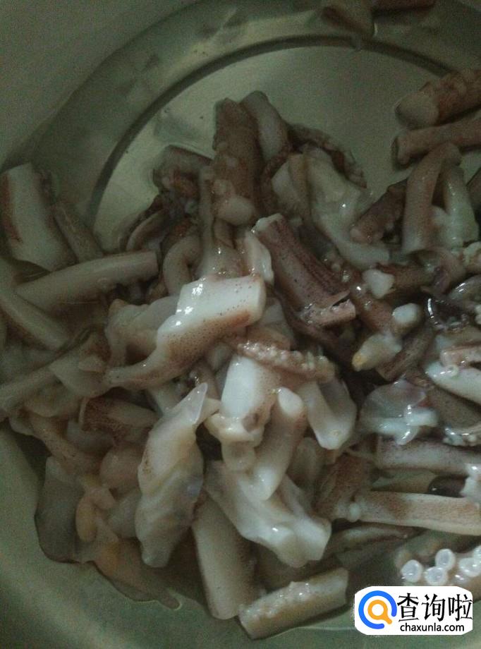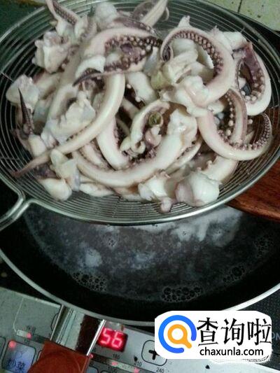 锅中加入适量水,少量料酒,水开后倒入处理好的鱿鱼,煮1分钟捞出,冷水冲洗干净,沥干水分备用。
