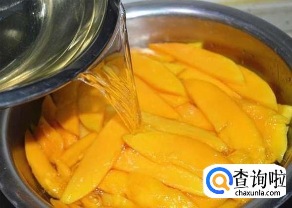 然后再在锅中加入适量清水和白糖,开中火煮至砂糖完全溶化,调制好腌制芒果肉的汁,把切好的芒果腌制在调好的汁里。