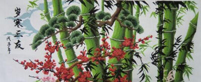 “岁寒三友”是我国文化界最受欢迎的题材之一。松、竹、梅这三位仁兄之所以会“结伴为友”,追溯起来要去到北宋。东坡居士开垦荒地,在自家田边小屋的院子里种植了许多花木,且还惺惺相惜地将四季常青的松树、枝干挺拔的绿竹和冷艳报春的冬梅,称作与自己严冬相伴的三位好友。从此以后,这三位寒风中的斗士在古人眼中,便成了一个铁骨铮铮的“组合”。到深秋之后,百花皆谢,唯有松、竹、梅花,岁寒三友。同样生命旺盛,同样坚贞高洁,“松、竹、梅”因此而成为历代诗书画中最常见的题材。