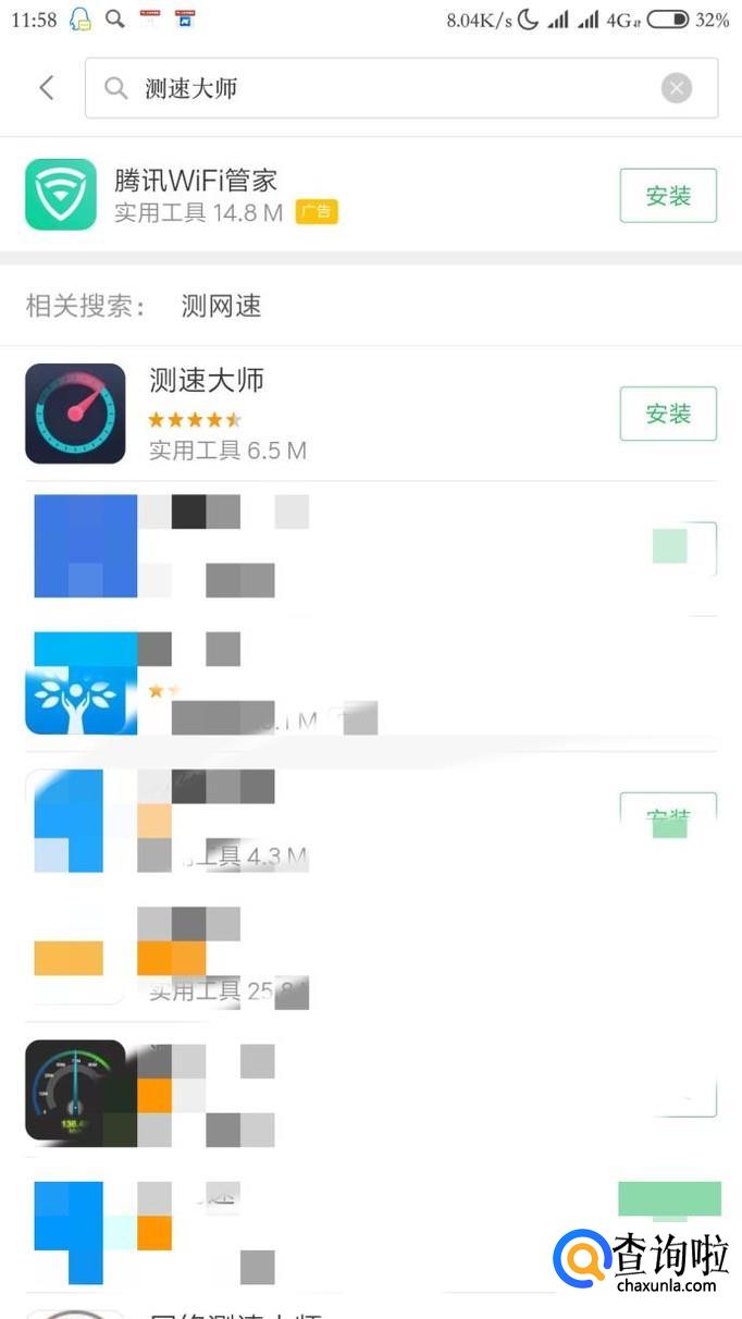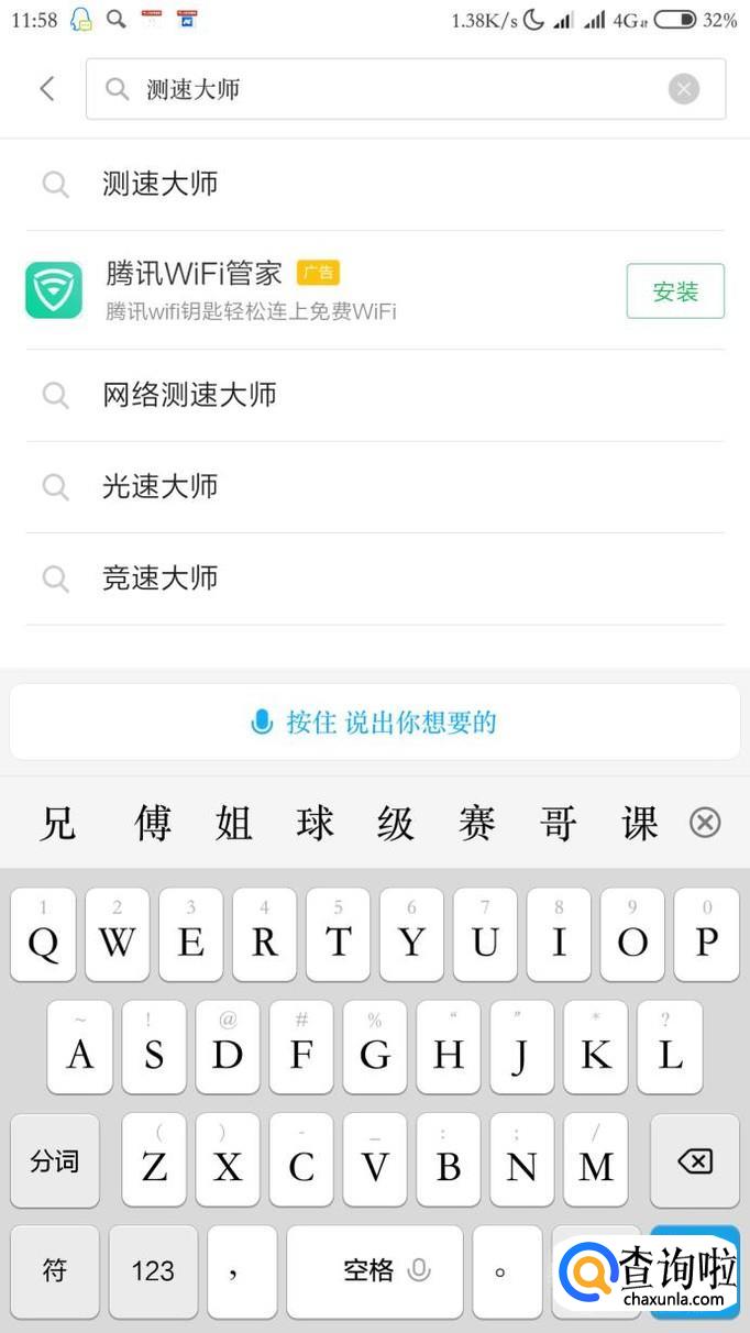 打开我们手机自带的应用商店,搜索“测速大师”。