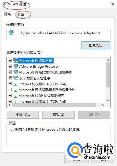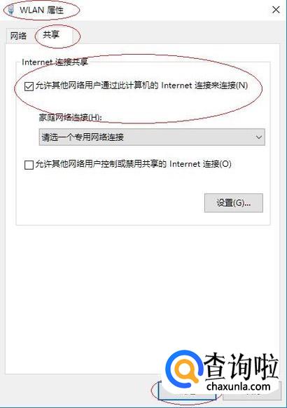 如图所示,弹出"WLAN 属性"对话框。选择"共享"标签,下步将进行设置网络共享让其他电脑上网的操作。