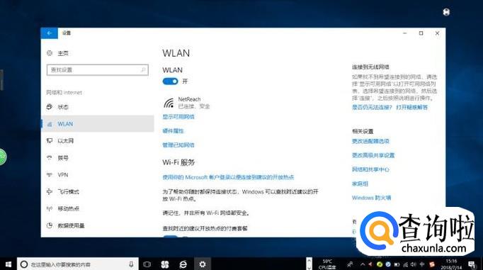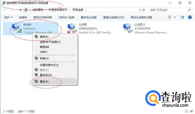 弹出"网络连接"对话框,如图所示。鼠标右击"WLAN"图标,弹出快捷菜单选择"属性"项。
