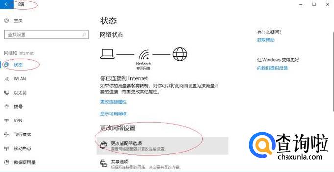 如图所示,唤出"网络和Internet"选项界面。选择"状态→更改网络设置"选项,点击"更改适配器选项"图标。