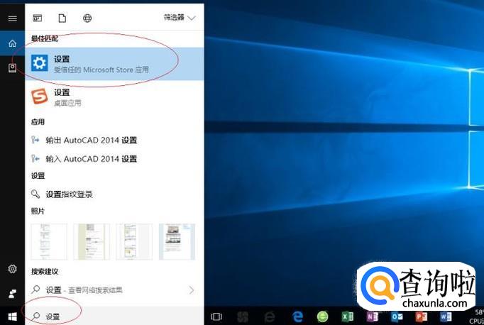 如图所示,搜索框输入"设置"。Cortana(小娜)显示搜索结果,点击"最佳匹配→设置"项。
