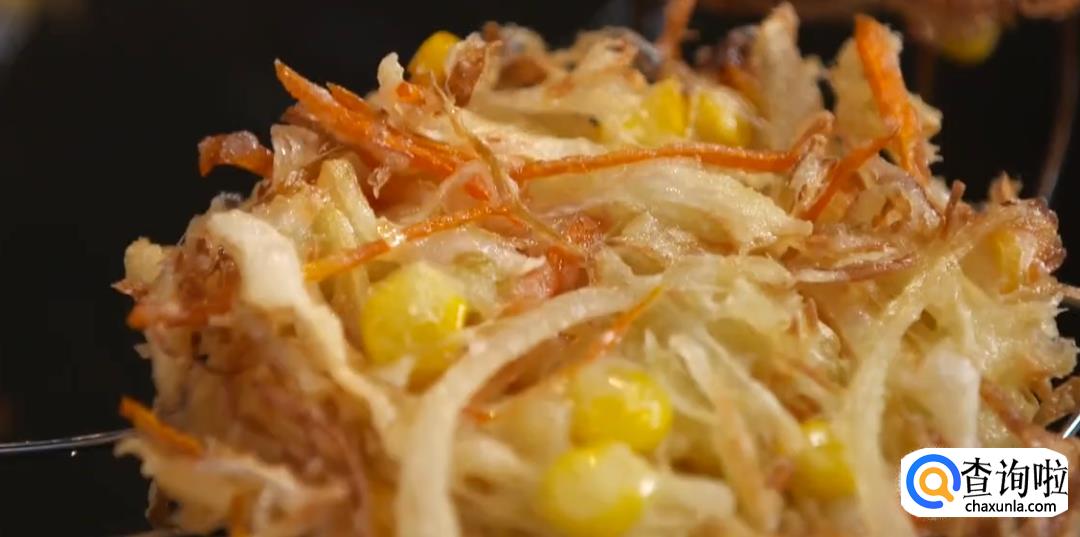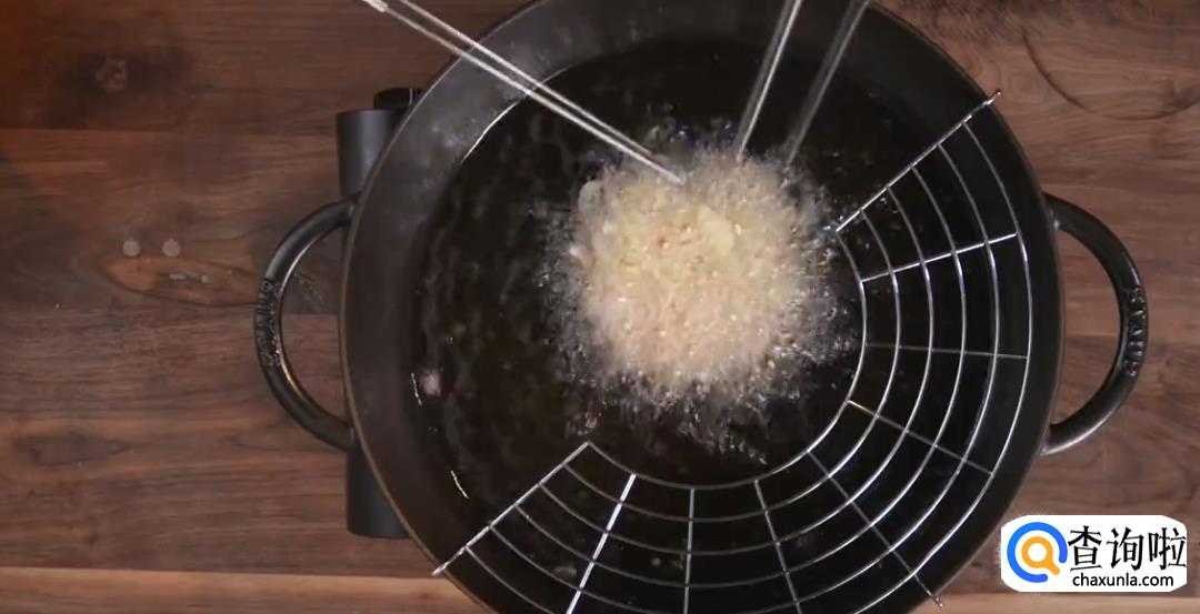 然后用漏勺盛出,放入七八成熟的油中,炸三分钟,待衣面色泽金黄即可。