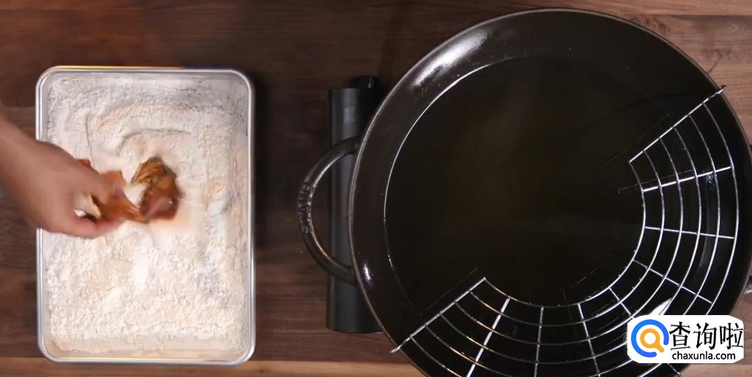腌制过的鸡腿儿肉,裹上小麦粉和土豆淀粉的混合物(比例为1:1)。