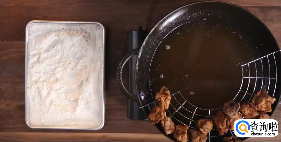 抖掉多余的面粉,放入七八成热的油中,炸2-3分钟。捞出沥干放置3分钟。
