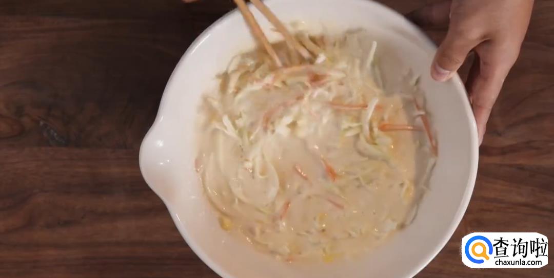 放入卷心菜丝,胡萝卜丝,洋葱丝,玉米粒,混合搅拌均匀。