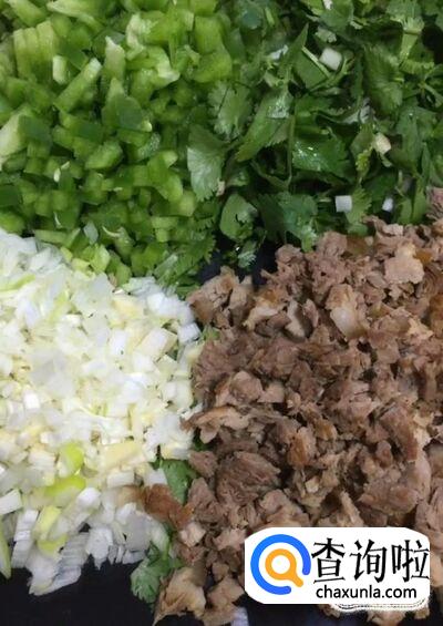 然后我们将葱,青椒,卤好的猪肉,香菜全部剁碎备用