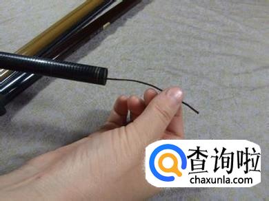 然后,把鱼线的结套在鱼竿上,并且慢慢的拉紧它。这样,我们就可以把鱼线绑在鱼竿上了。