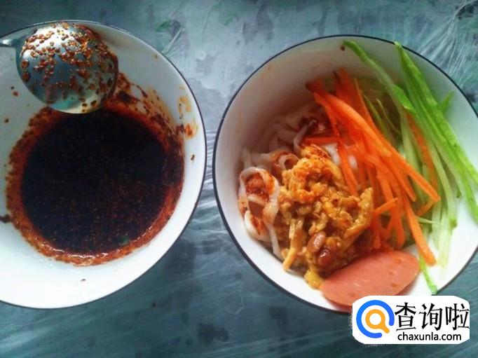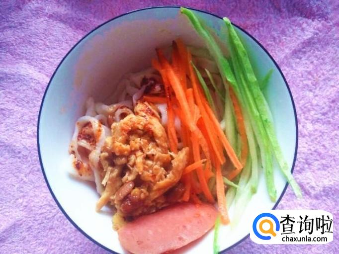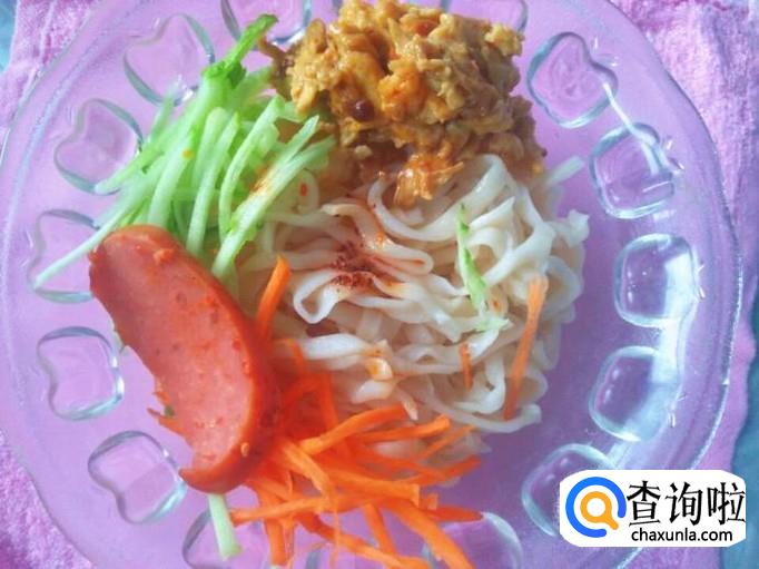 黄瓜丝、胡萝卜丝分别码在面条上,浇上刚刚做好的鸡蛋酱,放几片火腿放在上面,喜欢吃面条时放香油的可以倒一点点,但我不喜欢,吃的就是这个清爽的劲,倒上香油就有些腻了。但是可以适当放一点点辣椒油。